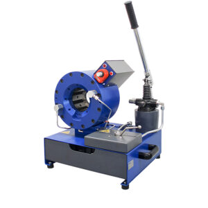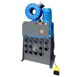 Crimping machine with electrical control and analog measuring micrometer, which is siutable for 4SP flexible hydraulic hoses up to 2″ and for industrial hoses up to 3”.