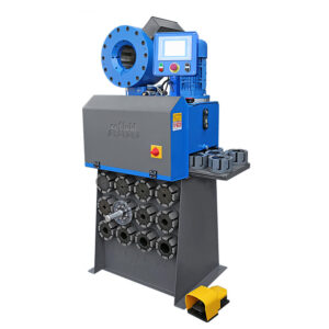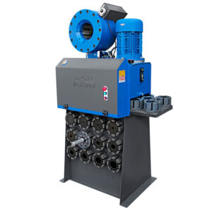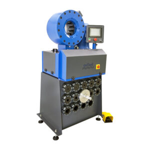 Crimping machine with multilingual touch-screen and optical encoder, which is suitable for 4SP flexible hydraulic hoses up to 2″ and for industrial hoses up to 3”.