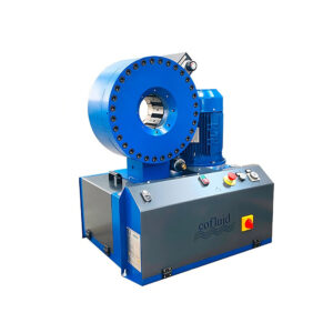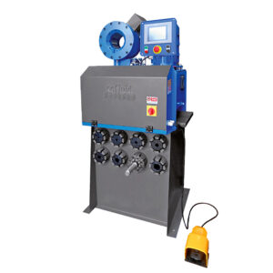 Crimping machine with multilingual touch-screen and optical encoder, which is suitable for R2 flexible hydraulic hoses up to 1.1/2″ 4Sp.