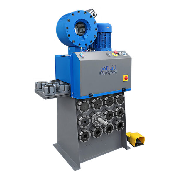 Crimping machine with electrical control and analog measuring micrometer, which is siutable for 4SP flexible hydraulic hoses up to 2″ and for industrial hoses up to 3”.